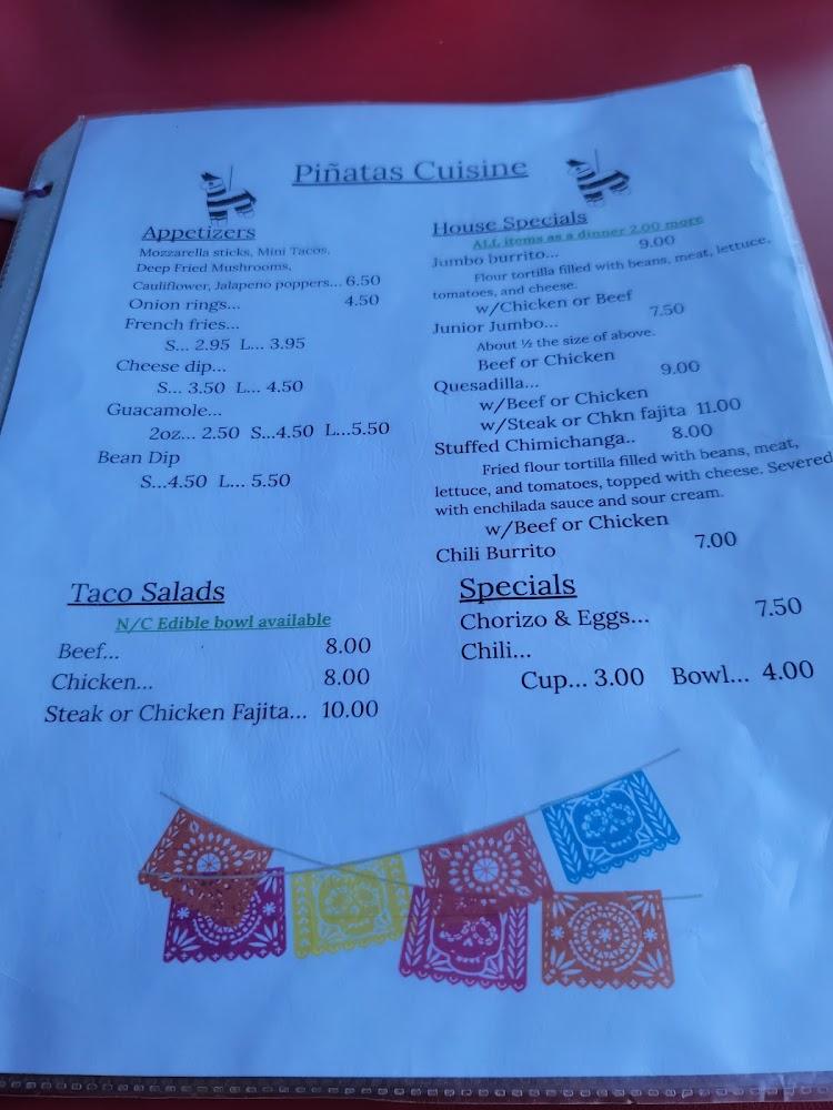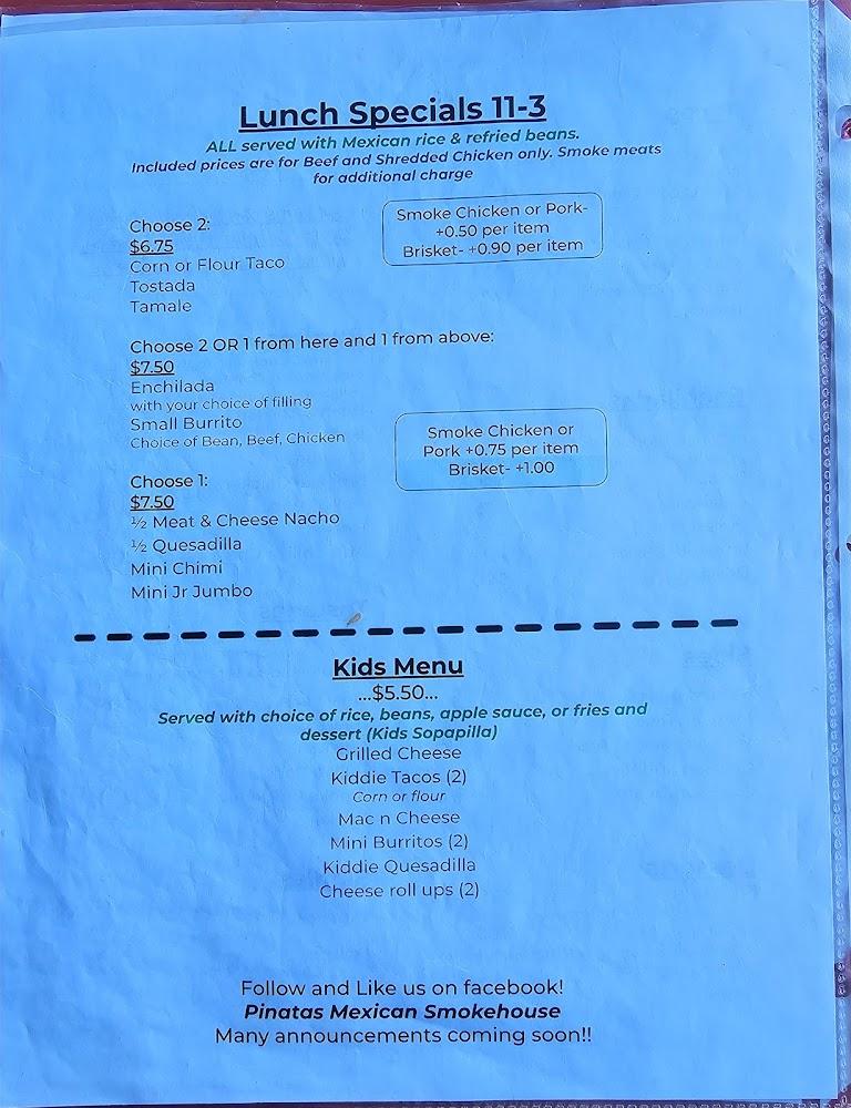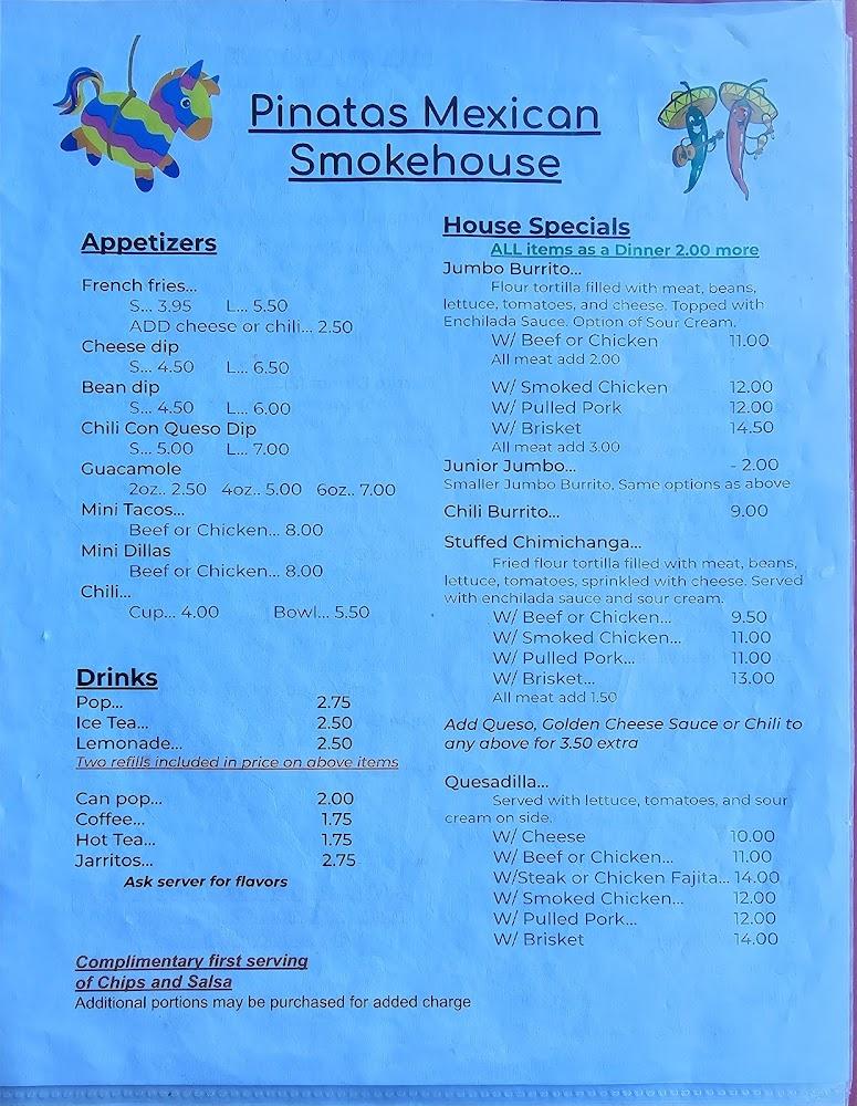 The menu at Pinatas Mexican Smokehouse highlights traditional Mexican favorites with a smoky twist. Featuring a variety of tacos, burritos, and nachos, the options cater to diverse tastes.